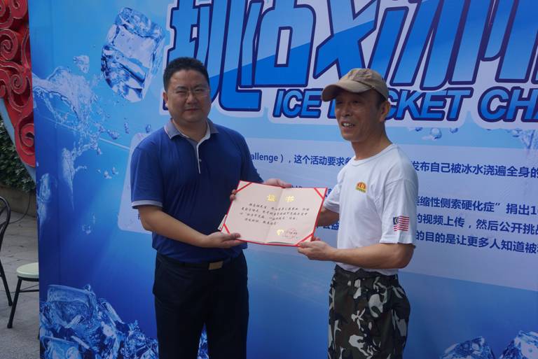 9月1日上午10时,广州市政协委员韩志鹏在广州市白云山山顶广场挑战冰桶,并向广州市慈善会捐赠100美元,定向用于北京瓷娃娃罕见病关爱基金下设的“冰桶挑战”专项基金,救助渐冻人群体。广州市慈善会秘书长汪中芳现场接受了韩志鹏委员的捐款,并回赠了捐赠证书。当天下午,市慈善会将捐款划拨给了北京瓷娃娃罕见病关爱中心。