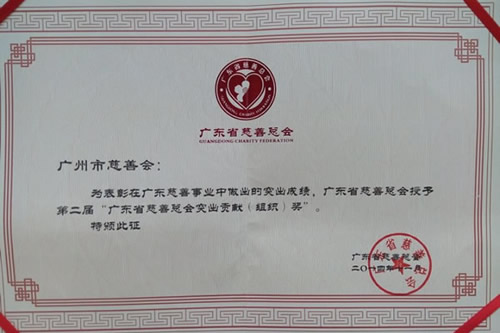 在2014年11月13日广东省慈善总会第三届会员代表大会上,广州市慈善会因在过去的五年,始终恪守“扶贫济困,见难相助”的办会宗旨,坚持依法创办、规范管理,不断创新方式、挖掘潜力,工作业绩突出,社会反响良好,对推动广东省慈善事业发展具有示范和推广价值,被大会授予“广东省慈善总会突出贡献(组织)奖”。