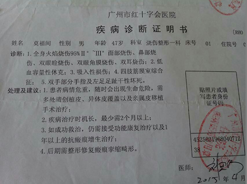事故发生后,莫福间全身95%被烧伤。由于烧伤面积太大,伤势严重,4月4日下午2点,三姐妹将父亲转院到了广州市海珠区红十字会医院进行治疗。