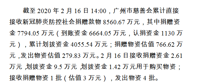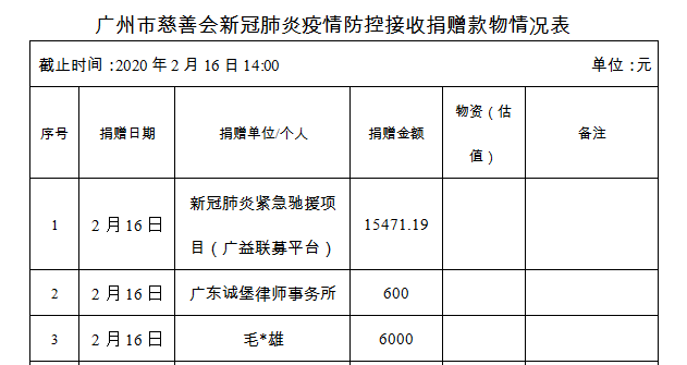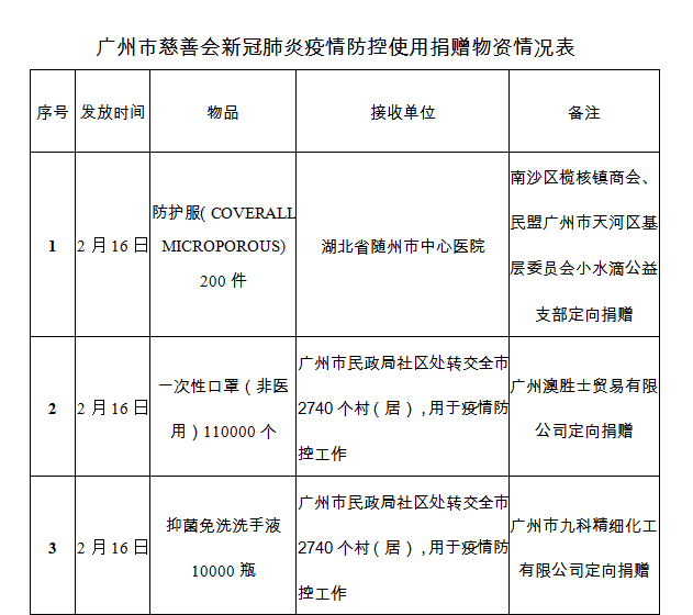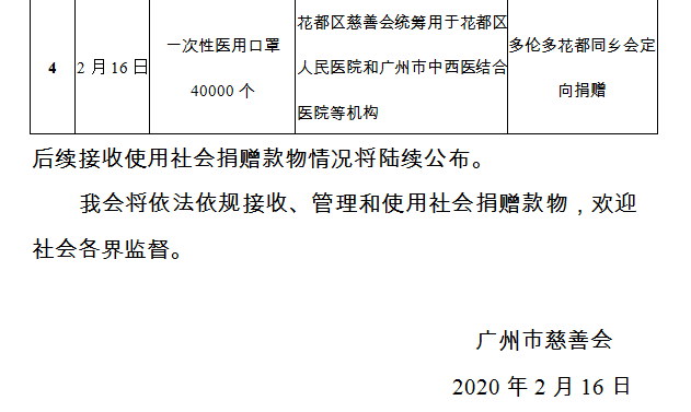广州市慈善会关于新冠肺炎防控社会捐赠款物接收使用情况的公告(十六)