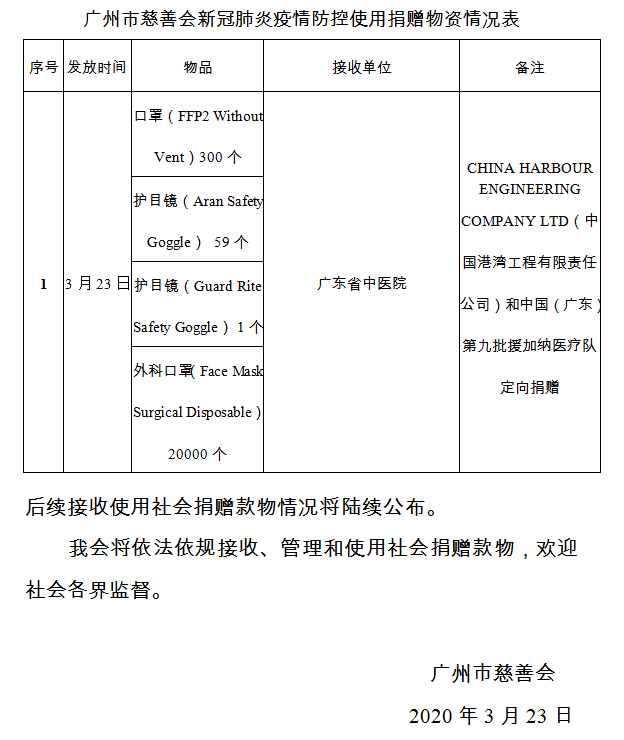 广州市慈善会关于新冠肺炎防控社会捐赠款物接收使用情况的公告(五十二)