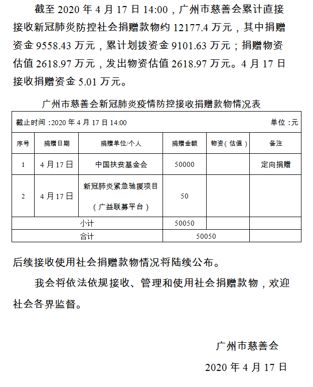 广州市慈善会关于新冠肺炎防控社会捐赠款物接收使用情况的公告(七十七)