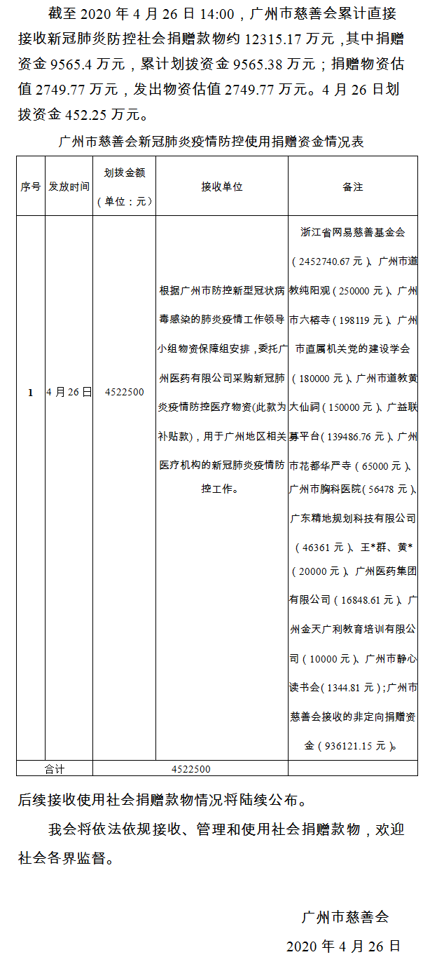 广州市慈善会关于新冠肺炎防控社会捐赠款物接收使用情况的公告(八十六)