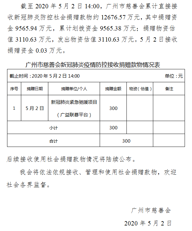 广州市慈善会关于新冠肺炎防控社会捐赠款物接收使用情况的公告(九十二)