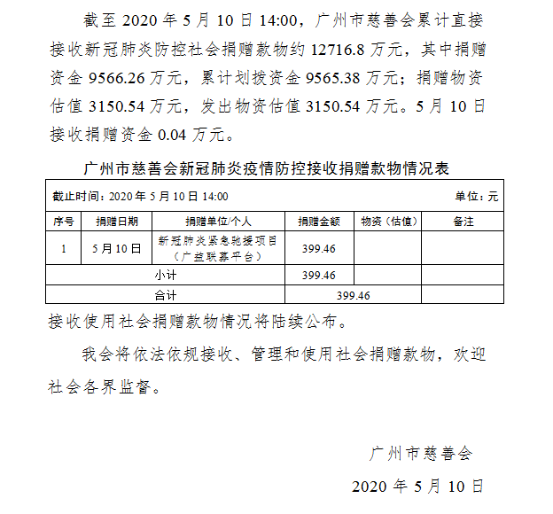 广州市慈善会关于新冠肺炎防控社会捐赠款物接收使用情况的公告(一百)