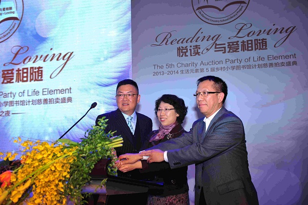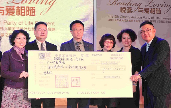 2014年1月18日晚,第五届“悦读?与爱相随乡村小学图书馆建设基金”慈善拍卖活动在广州南丰朗豪酒店成功举办。本次慈善拍卖活动由广州市慈善会和生活元素杂志社共同主办,南丰朗豪酒店和华南超级跑车协会协办。市民政局副局长、市慈善会副会长易利华女士,生活元素杂志社董事长李弦先生和来自社会各界的善长仁翁近200人出席了本次活动。现场爱心人士积极举牌参与竞拍,并踊跃认捐乡村图书馆。本次活动共拍出16件爱心拍品,认捐乡村小学图书馆14间,共筹集善款123.18万元。