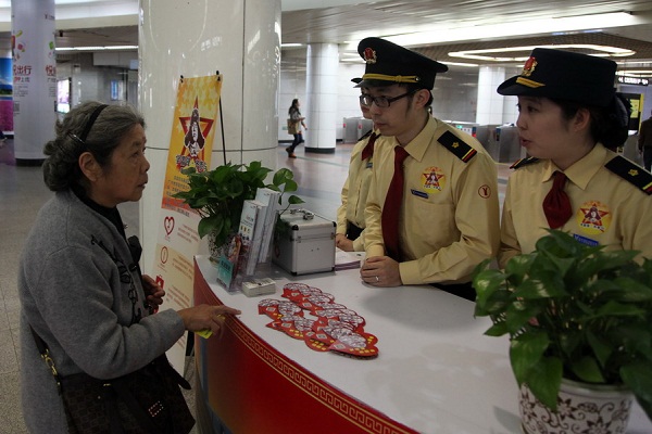 图片1 乘客在地铁站爱心咨询台领取“慈善一元捐”爱心卡片