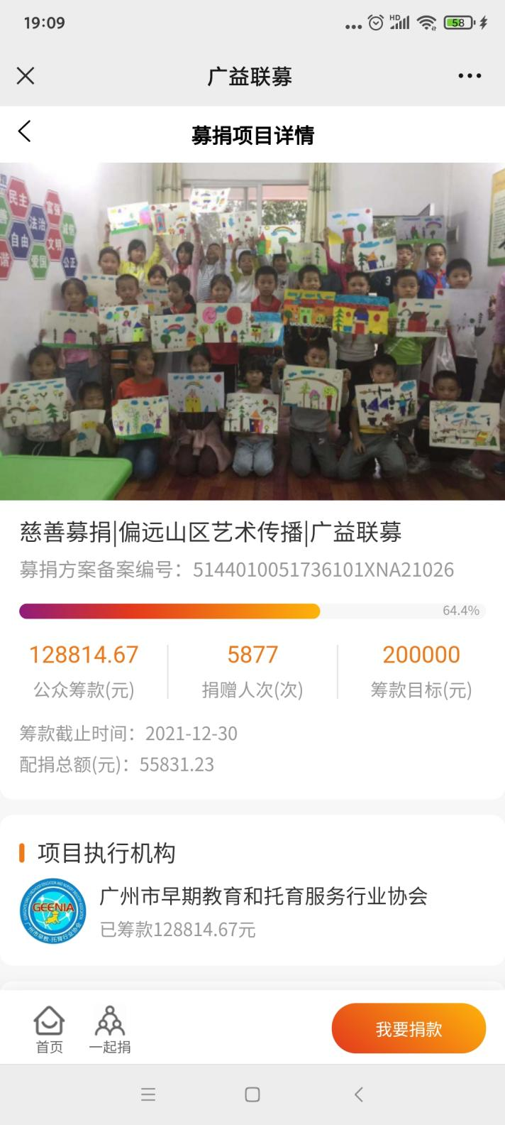 2021年8月10日至2021年11月7日,偏远山区艺术传播项目在广益联募平台筹得184646.9元(公众筹款128815.67元、爱心池配捐55831.23元)