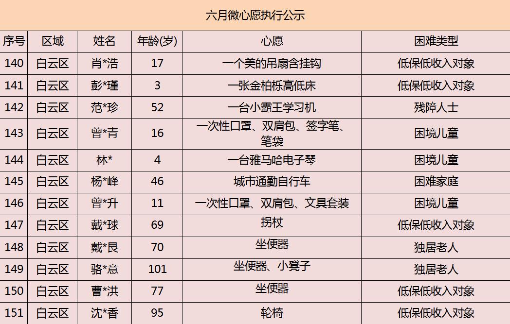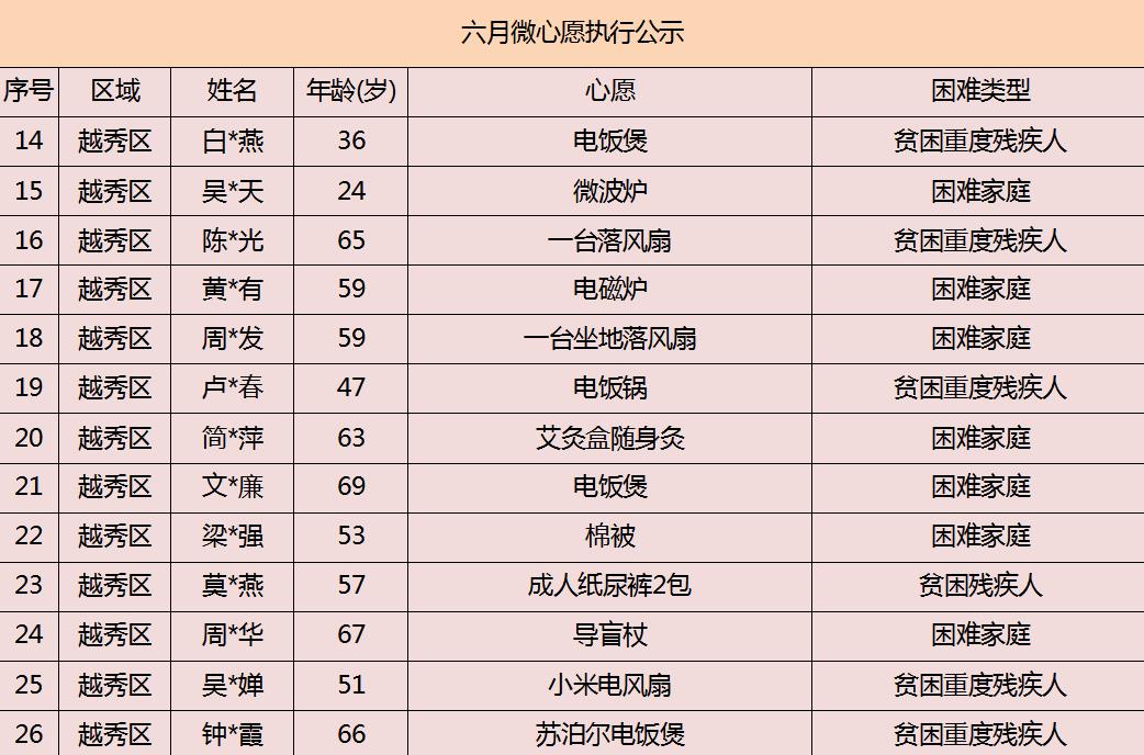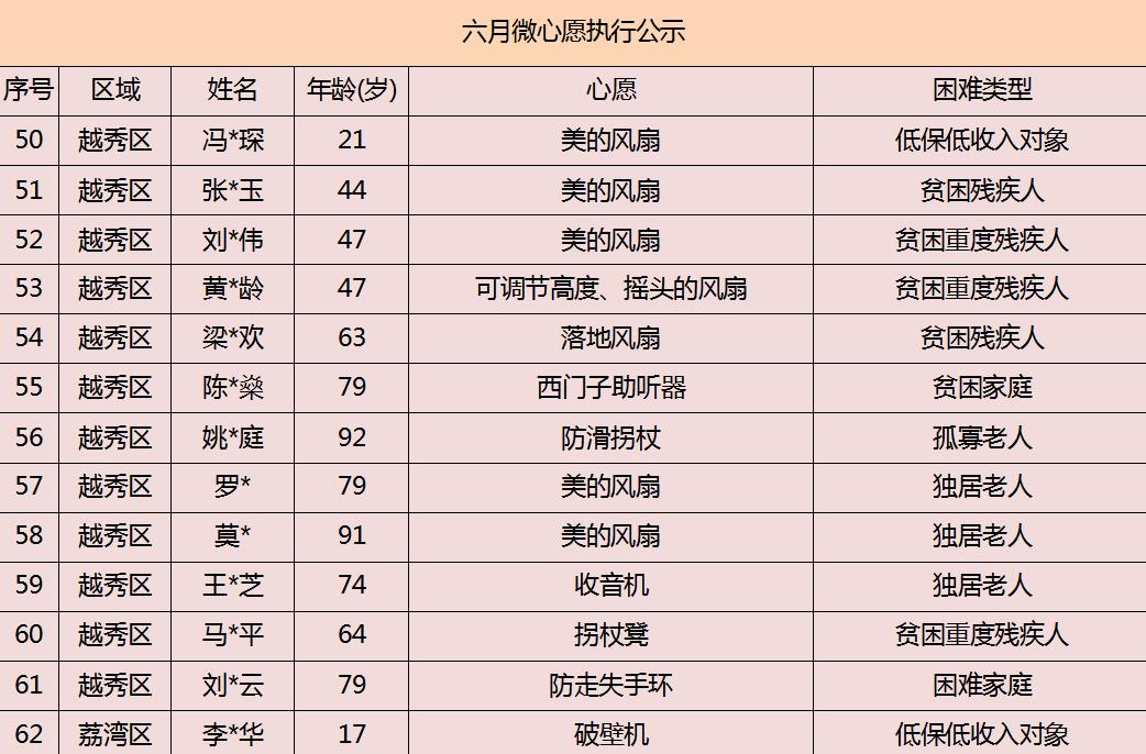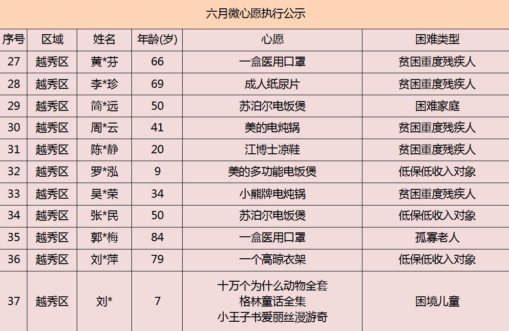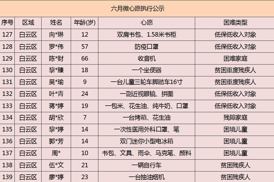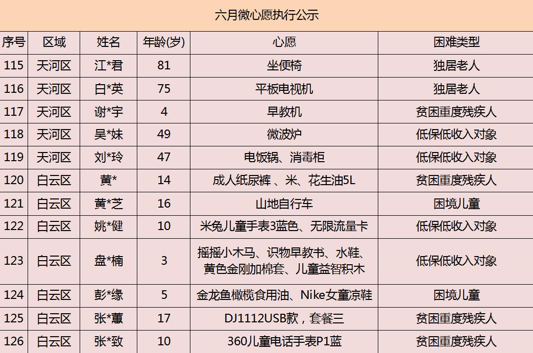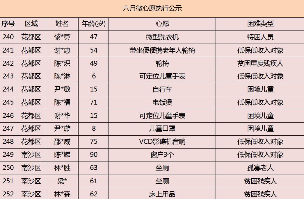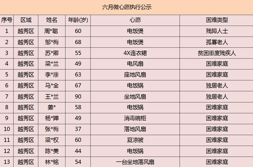 2020年广州市慈善会6月“微心愿·善暖万家”执行名单公示